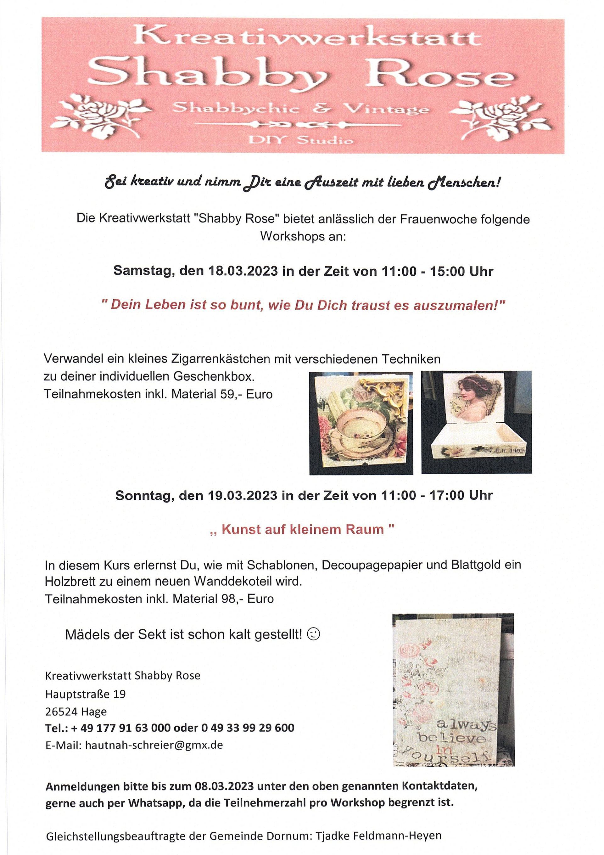 Die Kreativwerkstatt "Shabby Rose" bietet anlässlich der Frauenwoche folgende Workshops an: